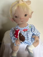 Aletta is a darling 23” blonde fairy with wide, wonder-filled eyes and a heart full of woodland curiosity. Dressed in her blue gingham bubble romper adorned with cheerful mushrooms, she looks as though she’s just wandered out of a storybook garden. Her tiny mushroom plushie is her constant companion, joining her on gentle fairy adventures filled with imagination, giggles, and cozy forest magic.