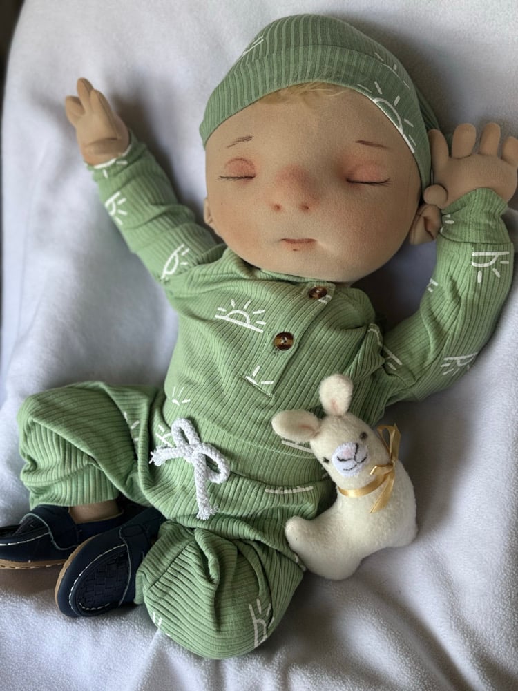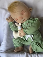 Emerson is a sweet 22” sleeping baby boy, andrests peacefully with a tiny tuft of golden blonde hair peeking softly from his cap. Calm and content, he drifts through gentle dreams while holding tight to his beloved llama plushie, Malla, his constant little companion. Serene and cuddly, he brings a quiet sweetness wherever he’s nestled, perfect for peaceful snuggles and tender moments.