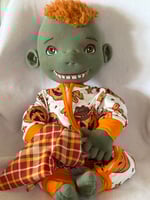His short orange hair is made from a fuzzy knit fabric that is sewn to his head.