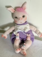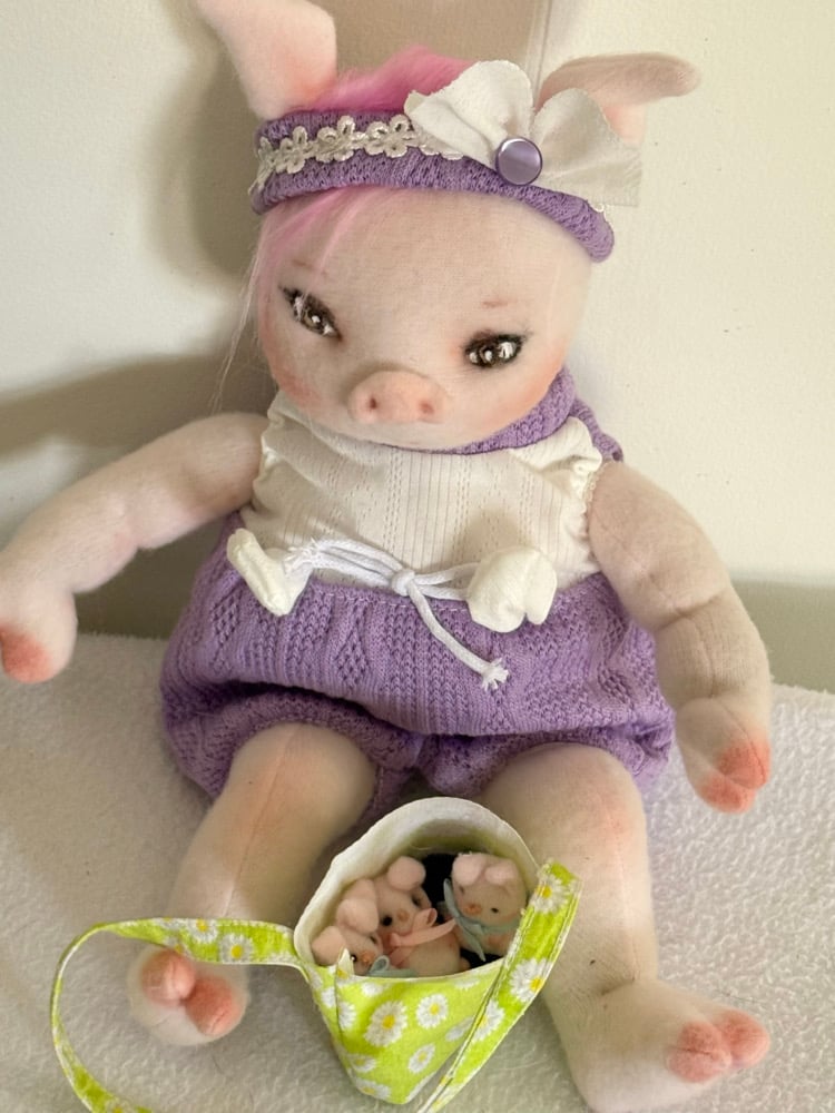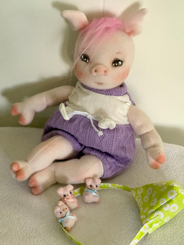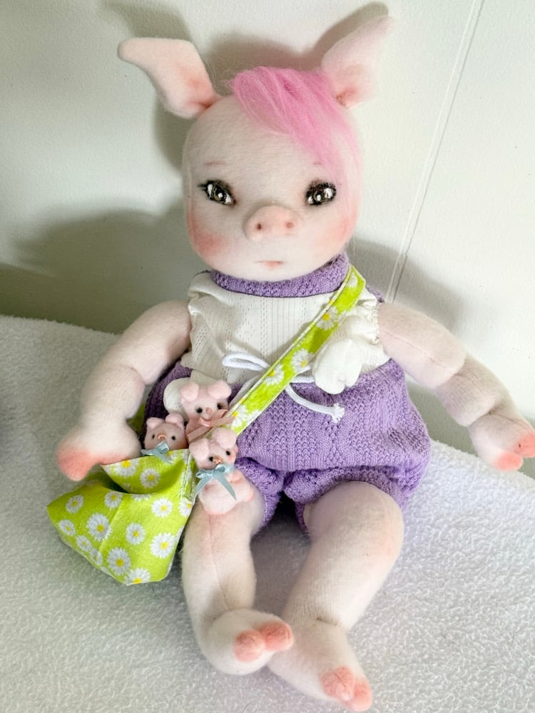 Noelle is a darling 14” little piglet with a gentle heart and a very important job, caring for her three tiny piglets, Barnaby, Rustler, and Toots. Tucked safely inside her green daisy print shoulder bag, her little companions travel everywhere with her. Sweet, nurturing, and always prepared for a small adventure, Noelle brings warmth, comfort, and just a touch of farmyard magic wherever she goes.